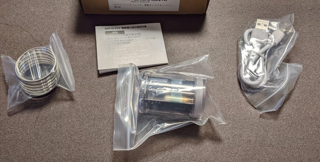 箱にはH.T.G ベーシックの文字。中身はトレーサー本体とサプレッサー内でテンションかける為のスプリングとUSBケーブル、そして英語と中国語の取説だ!