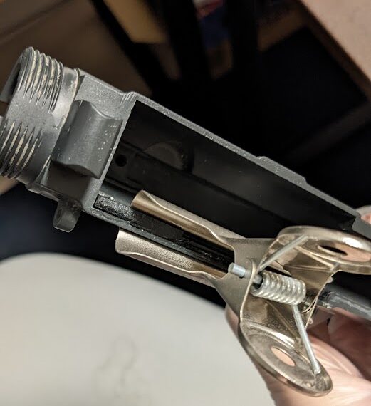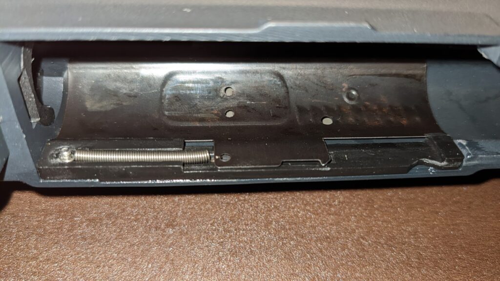画像が少なくてわかりにくいけど、アッパーの裏側に樹脂製のレールみたいなのが接着されていて、そこに上の写真のピンとダミーボルトカバーがスプリングで引っかけてあり、スプリングの