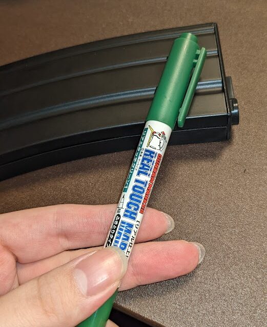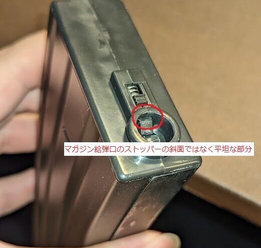 そこでチャンバーの給弾口に水性ペンで塗って、マガジン挿入して当たり面の確認したところ、マガジン給弾口のストッパーの根元3㎜くらいの平坦部に当たってるのが分かった。